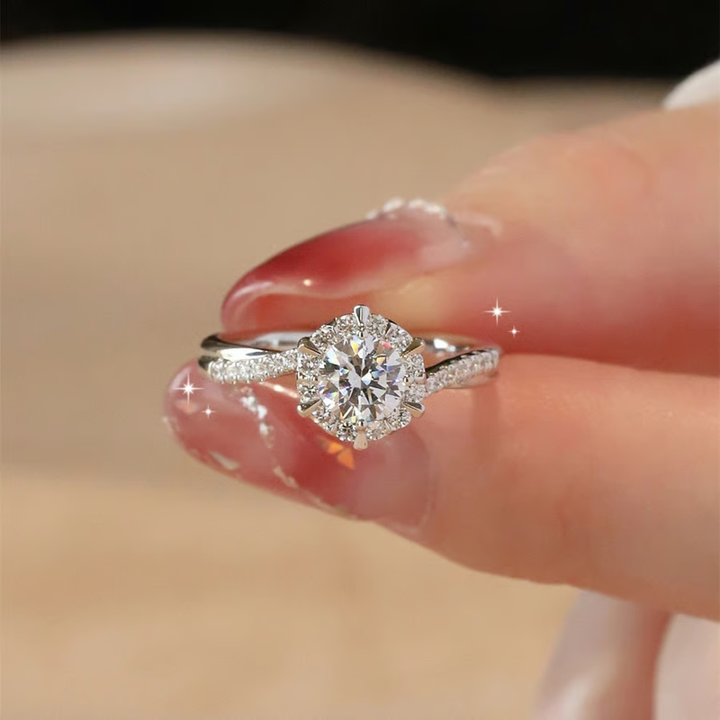 Also known as "moissanite from the stars", love brings hope like the stars. 12 small moissanite stones linger around the main stone, symbolizing the slow collection of romance, circling time and promise on your fingertips.