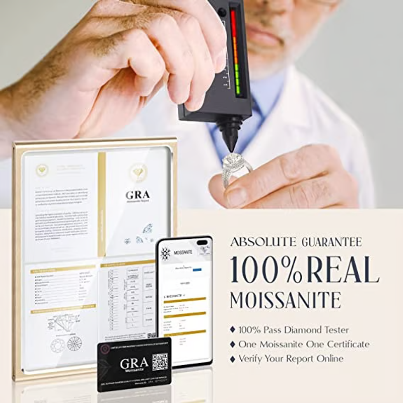 All of our moissanites are GRA certified, 100% passed the diamond tester to obtain the highest score, lead and nickel free, and hypoallergenic.