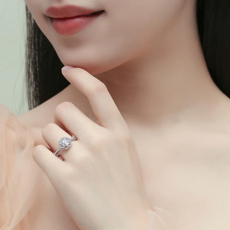 The moissanite halo ring is crafted in superior S925 sterling silver, tarnish and discolor resistant. 6-Prong setting with D Color VVS1 moissanite, 1 x 1Ct (6.5*6.5mm) main stone, 12 x 1.5*1.5mm smaller stones (around the main stone), 16 x 1.2*1.2mm smallest stones (for silver ring body).